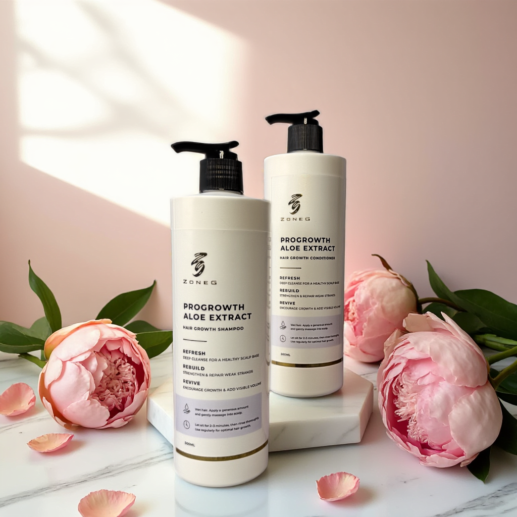 With every wash, ZONEG Shampoo & Conditioner delivers visible transformation. Infused with Aloe Extract and nourishing ingredients, it works deep into your scalp and strands to boost growth, strengthen weak hair, restore radiant shine, and protect against damage. Healthy, beautiful hair starts here.